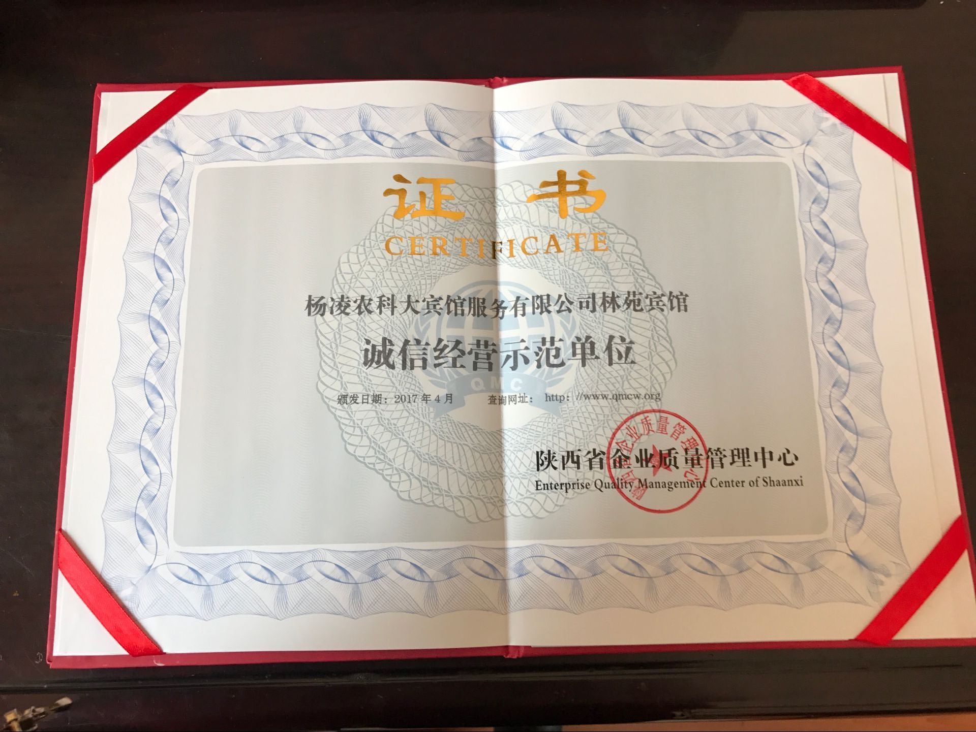 近期,在陕西省企业质量管理中心组织开展的“企业、质量、诚信”主题评比活动中,公司下属企业杨凌农科大宾馆服务有限公司林苑宾馆获评“诚信经营示范单位”。陕西省企业质量管理中心为获此荣誉的单位颁发了奖牌和证书。