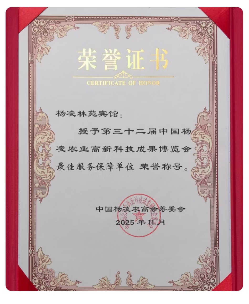 杨凌示范区近日召开第三十二届农高会表彰大会。林苑宾馆被授予“最佳服务保障单位”荣誉称号。这是继上届农高会后,林苑宾馆再次以“零事故、零投诉”的成绩获得组委会肯定。